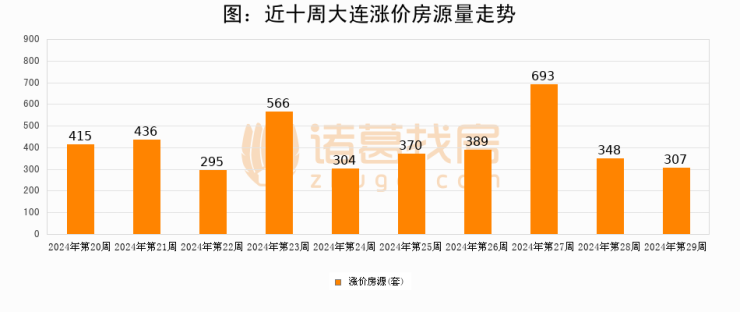 从调价房源来看,第29周大连涨价房源307套,较上周下降11.8%。与此同时,29周涨价房源占比回落0.01个百分点,业主信心小幅波动,购房者可则需入市。
