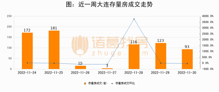 从存量房来看,2022年11月30日大连存量房单日成交93套,比昨日减少30套,环比下降24.4%。从近一周存量房成交来看,大连存量房日均成交套数为100套,其中11月25日成交量最高为181套,11月30日单日成交93套,低于近一周平均水平7%。