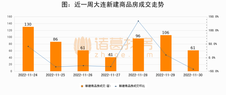 根据大连市住房保障和房屋管理局数据显示,2022年11月30日大连新建商品房成交61套,较昨日减少45套,环比下降42.4%