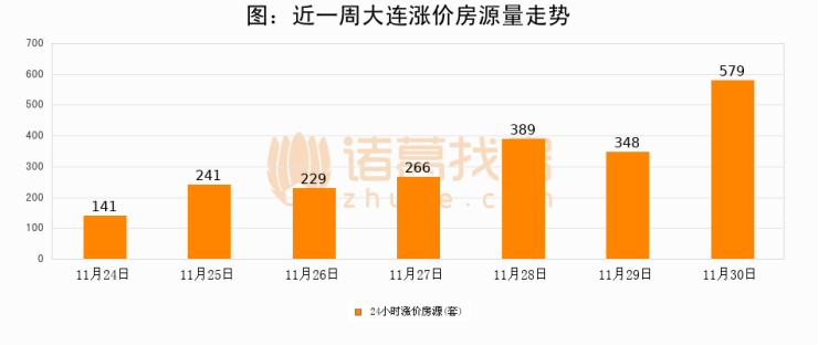 根据诸葛找房数据显示,大连24小时涨价房源量为579套,较11月29日增加231套,环比上涨66.4%。与此同时,涨价房源占比小幅扩大,业主信心有所提升。