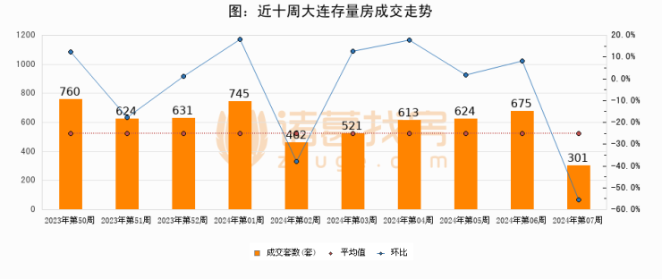 存量房方面,第06周大连存量房成交301套,较上周减少374套,环比下降55.4%。从近十周成交走势来看,周均成交套数为595套,本周低于平均水平49.4%。
