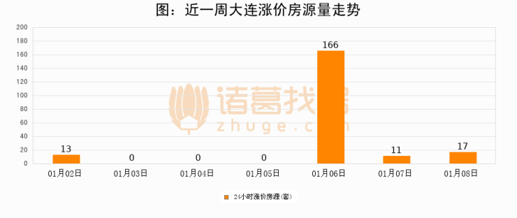 根据诸葛找房数据显示,大连24小时涨价房源量为17套,较01月07日增加6套,环比上涨54.5%。与此同时,涨价房源占比小幅扩大,业主信心有所提升。