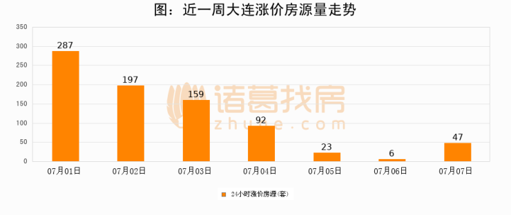 根据诸葛找房数据显示,大连24小时涨价房源量为47套,较07月06日增加41套,环比上涨683.3%。与此同时,涨价房源占比小幅扩大,业主信心有所提升。