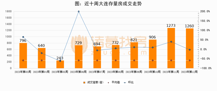 存量房方面,第12周大连存量房成交1260套,较上周减少13套,环比下降1%。从近十周成交走势来看,周均成交套数为809套,本周高于平均水平55.7%。