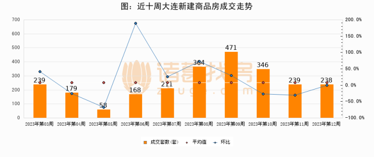 进入2023年第12周(03月13日-03月19日),大连新建商品房成交238套,较上周减少1套,环比下降0.4%