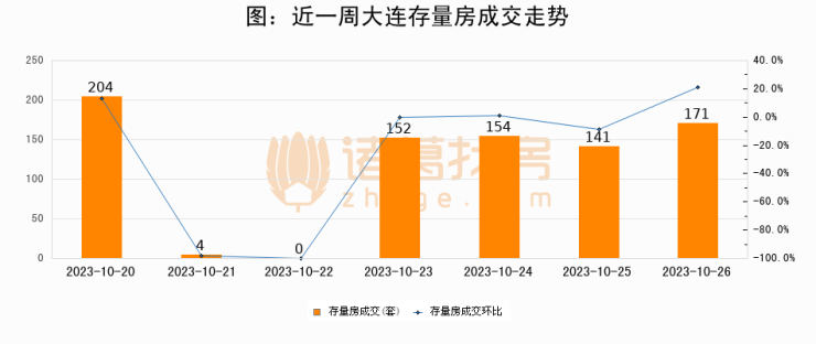 从存量房来看,2023年10月26日大连存量房单日成交171套,比昨日增加30套,环比上涨21.3%。从近一周存量房成交来看,大连存量房日均成交套数为118套,10月26日单日成交171套,高于近一周平均水平44.9%。