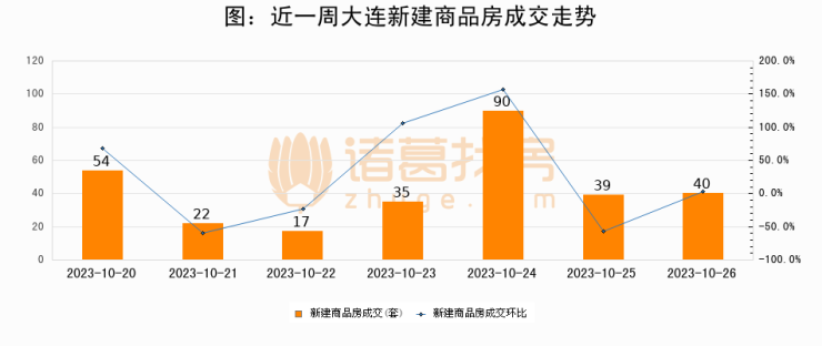 根据大连市住房保障和房屋管理局数据显示,2023年10月26日大连新建商品房成交40套,较昨日增加1套,环比上涨2.6%