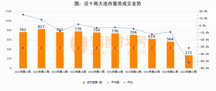 存量房方面,第52周大连存量房成交272套,较上周减少292套,环比下降51.8%。从近十周成交走势来看,周均成交套数为677套,本周低于平均水平59.8%。