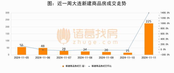 根据大连市住房保障和房屋管理局数据显示,2024年11月11日大连新建商品房成交225套,较昨日增加210套,环比上涨1400%