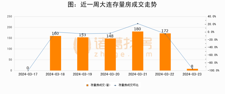 从存量房来看,2024年03月23日大连存量房单日成交8套,比昨日减少164套,环比下降95.3%。从近一周存量房成交来看,大连存量房日均成交套数为117套,03月23日单日成交8套,低于近一周平均水平93.2%。