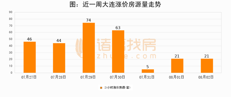 根据诸葛找房数据显示,大连24小时涨价房源量为21套,较08月01日持平。