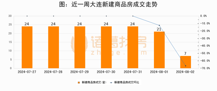 根据大连市住房保障和房屋管理局数据显示,2024年08月02日大连新建商品房成交7套,较昨日减少14套,环比下降66.7%