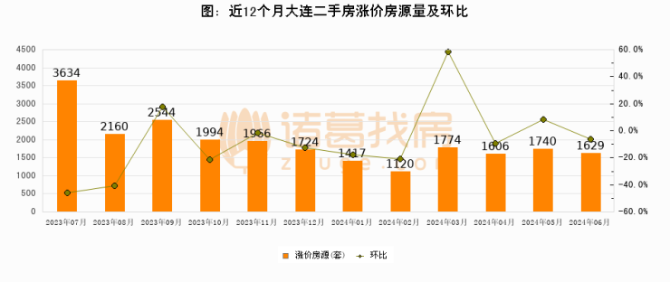 从调价房源来看,2024年6月,大连涨价房源为1629套,较上月下降6.4%。大连近两个月涨价房源量在1629套以上波动。与此同时,本月涨价房源占比小幅回落,业主信心尚待恢复,意向购房者可抓住时机入市。