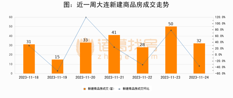 根据大连市住房保障和房屋管理局数据显示,2023年11月24日大连新建商品房成交32套,较昨日减少18套,环比下降36%