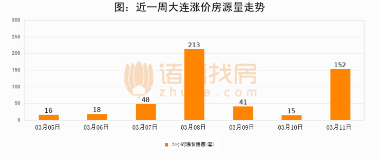 根据诸葛找房数据显示,大连24小时涨价房源量为152套,较03月10日增加137套,环比上涨913.3%。与此同时,涨价房源占比小幅扩大,业主信心有所提升。