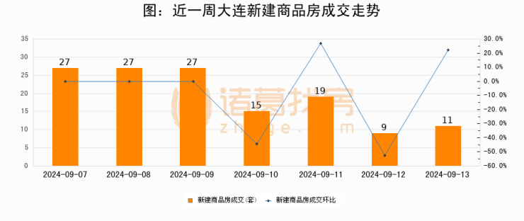 根据大连市住房保障和房屋管理局数据显示,2024年09月13日大连新建商品房成交11套,较昨日增加2套,环比上涨22.2%