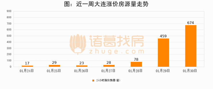 根据诸葛找房数据显示,大连24小时涨价房源量为674套,较01月29日增加215套,环比上涨46.8%。与此同时,涨价房源占比小幅扩大,业主信心有所提升。