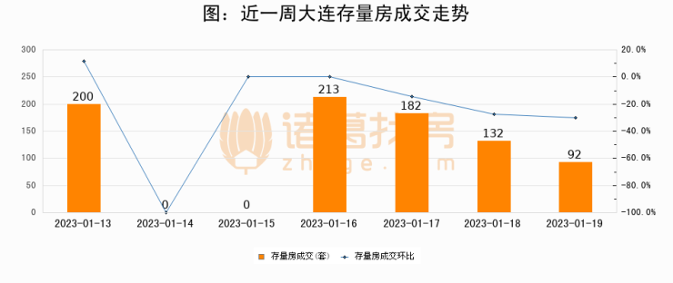 从存量房来看,2023年01月19日大连存量房单日成交92套,比昨日减少40套,环比下降30.3%。从近一周存量房成交来看,大连存量房日均成交套数为117套,其中01月16日成交量最高为213套,01月19日单日成交92套,低于近一周平均水平21.4%。