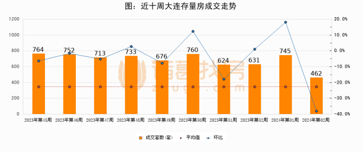 存量房方面,第01周大连存量房成交462套,较上周减少283套,环比下降38%。从近十周成交走势来看,周均成交套数为686套,本周低于平均水平32.7%。