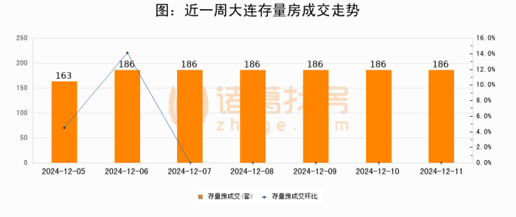 从存量房来看,2024年12月11日大连存量房单日成交186套,比昨日持平。。从近一周存量房成交来看,大连存量房日均成交套数为182套,12月11日单日成交186套,高于近一周平均水平2.2%。