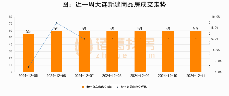 根据大连市住房保障和房屋管理局数据显示,2024年12月11日大连新建商品房成交59套,较昨日持平