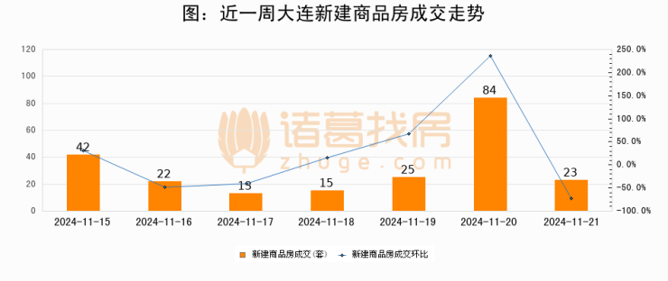 根据大连市住房保障和房屋管理局数据显示,2024年11月21日大连新建商品房成交23套,较昨日减少61套,环比下降72.6%