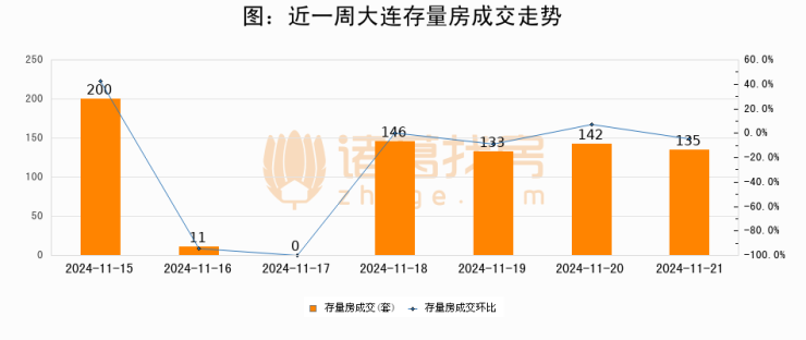 从存量房来看,2024年11月21日大连存量房单日成交135套,比昨日减少7套,环比下降4.9%。从近一周存量房成交来看,大连存量房日均成交套数为109套,11月21日单日成交135套,高于近一周平均水平23.9%。