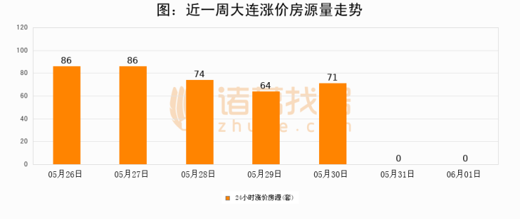 根据诸葛找房数据显示,大连24小时涨价房源量为0套,较05月31日持平。