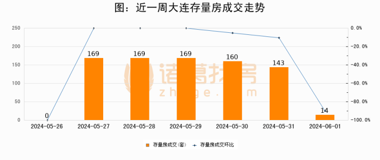 从存量房来看,2024年06月01日大连存量房单日成交14套,比昨日减少129套,环比下降90.2%。从近一周存量房成交来看,大连存量房日均成交套数为117套,06月01日单日成交14套,低于近一周平均水平88%。