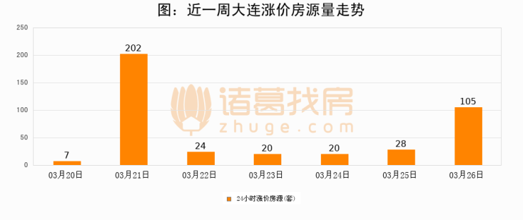 根据诸葛找房数据显示,大连24小时涨价房源量为105套,较03月25日增加77套,环比上涨275%。与此同时,涨价房源占比小幅扩大,业主信心有所提升。