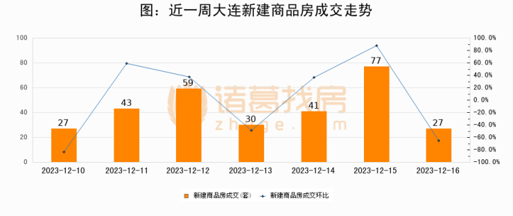根据大连市住房保障和房屋管理局数据显示,2023年12月16日大连新建商品房成交27套,较昨日减少50套,环比下降64.9%