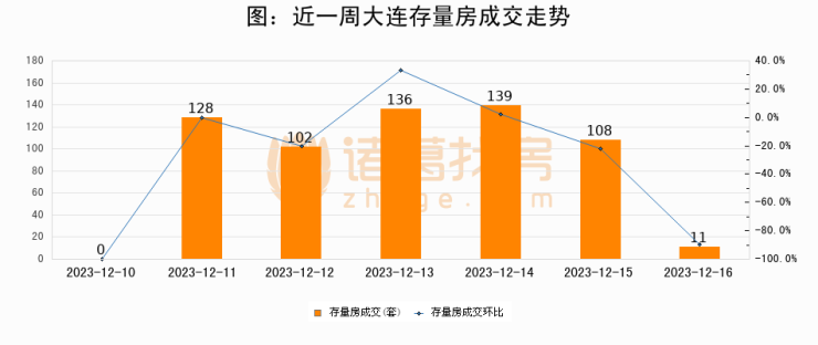 从存量房来看,2023年12月16日大连存量房单日成交11套,比昨日减少97套,环比下降89.8%。从近一周存量房成交来看,大连存量房日均成交套数为89套,12月16日单日成交11套,低于近一周平均水平87.6%。