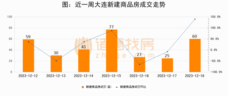 根据大连市住房保障和房屋管理局数据显示,2023年12月18日大连新建商品房成交60套,较昨日增加35套,环比上涨140%