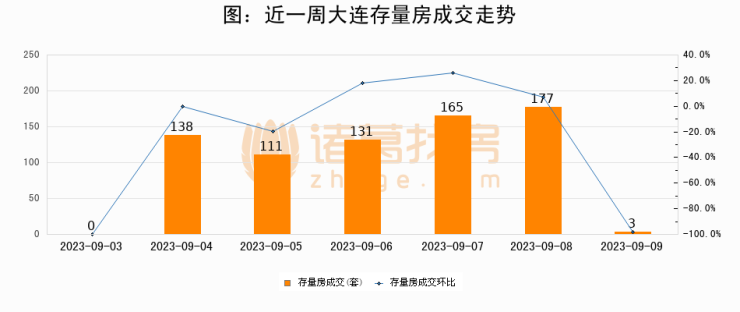 从存量房来看,2023年09月09日大连存量房单日成交3套,比昨日减少174套,环比下降98.3%。从近一周存量房成交来看,大连存量房日均成交套数为103套,09月09日单日成交3套,低于近一周平均水平97.1%。