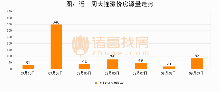根据诸葛找房数据显示,大连24小时涨价房源量为82套,较09月08日增加62套,环比上涨310%。与此同时,涨价房源占比小幅扩大,业主信心有所提升。