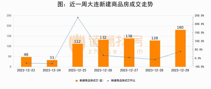 根据大连市住房保障和房屋管理局数据显示,2023年12月29日大连新建商品房成交180套,较昨日增加52套,环比上涨40.6%