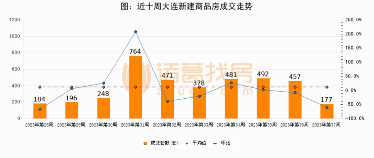 进入2023年第37周(09月04日-09月10日),大连新建商品房成交177套,较上周减少280套,环比下降61.3%