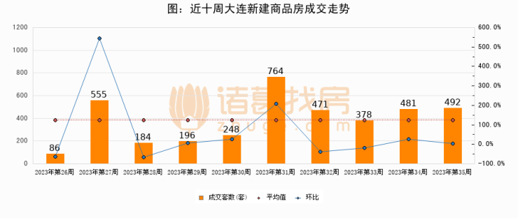 进入2023年第35周(08月21日-08月27日),大连新建商品房成交492套,较上周增加11套,环比上涨2.3%