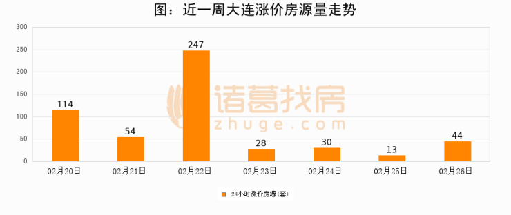 根据诸葛找房数据显示,大连24小时涨价房源量为44套,较02月25日增加31套,环比上涨238.5%。与此同时,涨价房源占比小幅扩大,业主信心有所提升。