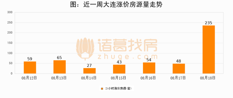 根据诸葛找房数据显示,大连24小时涨价房源量为235套,较08月17日增加187套,环比上涨389.6%。与此同时,涨价房源占比小幅扩大,业主信心有所提升。