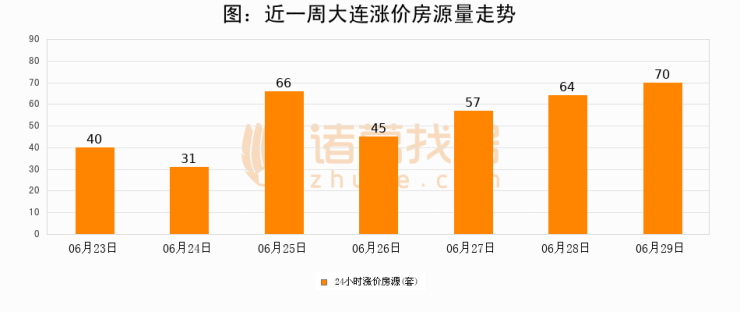 根据诸葛找房数据显示,大连24小时涨价房源量为70套,较06月28日增加6套,环比上涨9.4%。与此同时,涨价房源占比小幅扩大,业主信心有所提升。