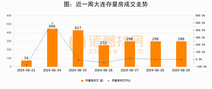 从存量房来看,2024年06月29日大连存量房单日成交298套,比昨日持平。。从近一周存量房成交来看,大连存量房日均成交套数为299套,06月29日单日成交298套,低于近一周平均水平0.3%。