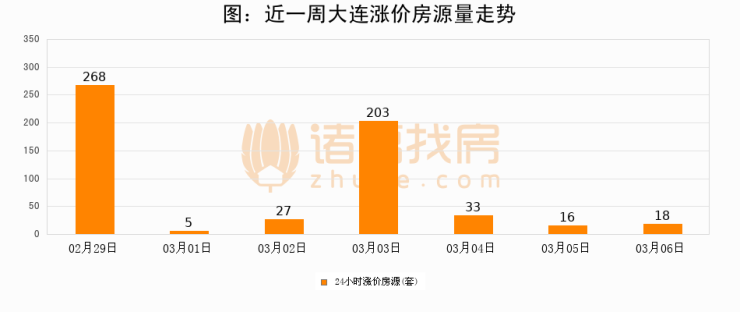 根据诸葛找房数据显示,大连24小时涨价房源量为18套,较03月05日增加2套,环比上涨12.5%。与此同时,涨价房源占比小幅扩大,业主信心有所提升。