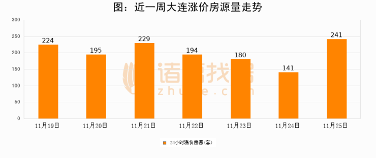 根据诸葛找房数据显示,大连24小时涨价房源量为241套,较11月24日增加100套,环比上涨70.9%。与此同时,涨价房源占比小幅扩大,业主信心有所提升。