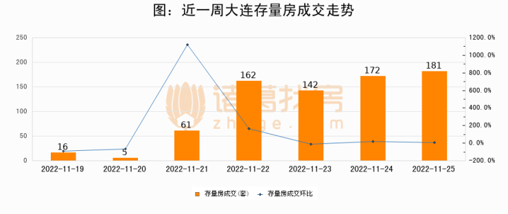 从存量房来看,2022年11月25日大连存量房单日成交181套,比昨日增加9套,环比上涨5.2%。从近一周存量房成交来看,大连存量房日均成交套数为105套,其中11月25日成交量最高为181套,11月25日单日成交181套,高于近一周平均水平72.4%。