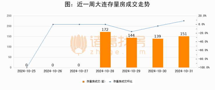 从存量房来看,2024年10月31日大连存量房单日成交151套,比昨日增加12套,环比上涨8.6%。从近一周存量房成交来看,大连存量房日均成交套数为86套,10月31日单日成交151套,高于近一周平均水平75.6%。