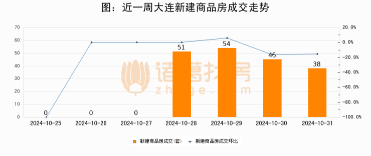 根据大连市住房保障和房屋管理局数据显示,2024年10月31日大连新建商品房成交38套,较昨日减少7套,环比下降15.6%
