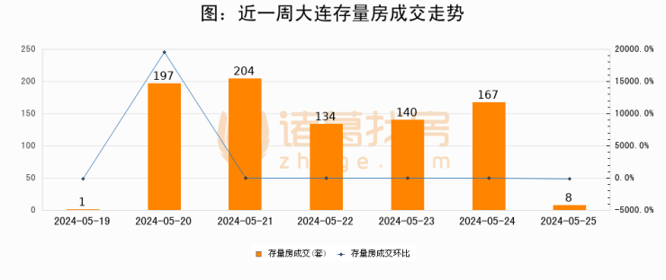 从存量房来看,2024年05月25日大连存量房单日成交8套,比昨日减少159套,环比下降95.2%。从近一周存量房成交来看,大连存量房日均成交套数为121套,05月25日单日成交8套,低于近一周平均水平93.4%。