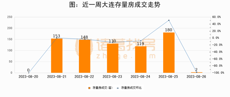 从存量房来看,2023年08月26日大连存量房单日成交2套,比昨日减少178套,环比下降98.9%。从近一周存量房成交来看,大连存量房日均成交套数为104套,08月26日单日成交2套,低于近一周平均水平98.1%。