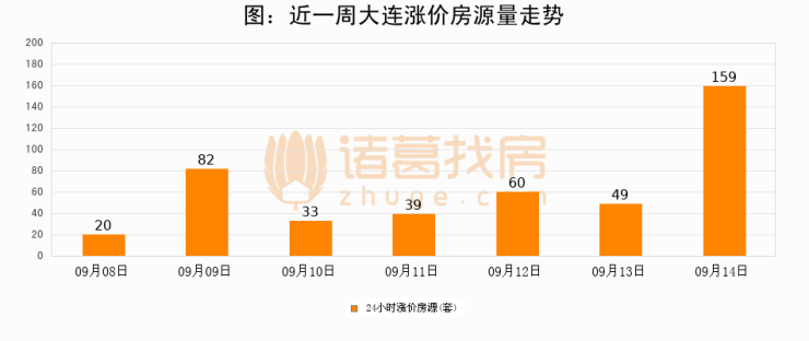根据诸葛找房数据显示,大连24小时涨价房源量为159套,较09月13日增加110套,环比上涨224.5%。与此同时,涨价房源占比小幅扩大,业主信心有所提升。